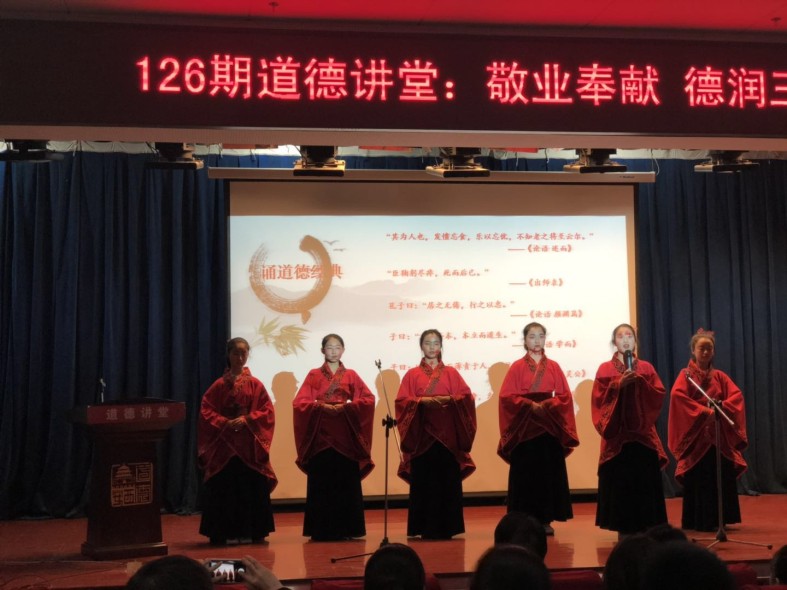 “其為人也,發憤忘食,樂以忘憂,不知老之將至云爾”,“臣鞠躬盡瘁,死而后已”學生代表朗誦的道德經典也再次說明愛崗敬業精神從古至今一直為人們所崇尚。